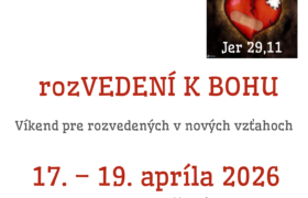 Pozývame vás na duchovnú obnovu rozVEDENÍ k BOHU v dňoch 17.-19. apríla 2026. Uskutoční sa v Rodinkove v Belušskch Slatinách. Je určená pre tých, ktorí po rozvode žijú v nových vzťahoch. Na duchovnú obnovu je možné prísť s deťmi, o ktoré sa postarajú animátori. Duchovnú obnovu pre túto skupinu rozvedených usporadúvame zvyčajne raz do roka. Prihlásiť sa je […]